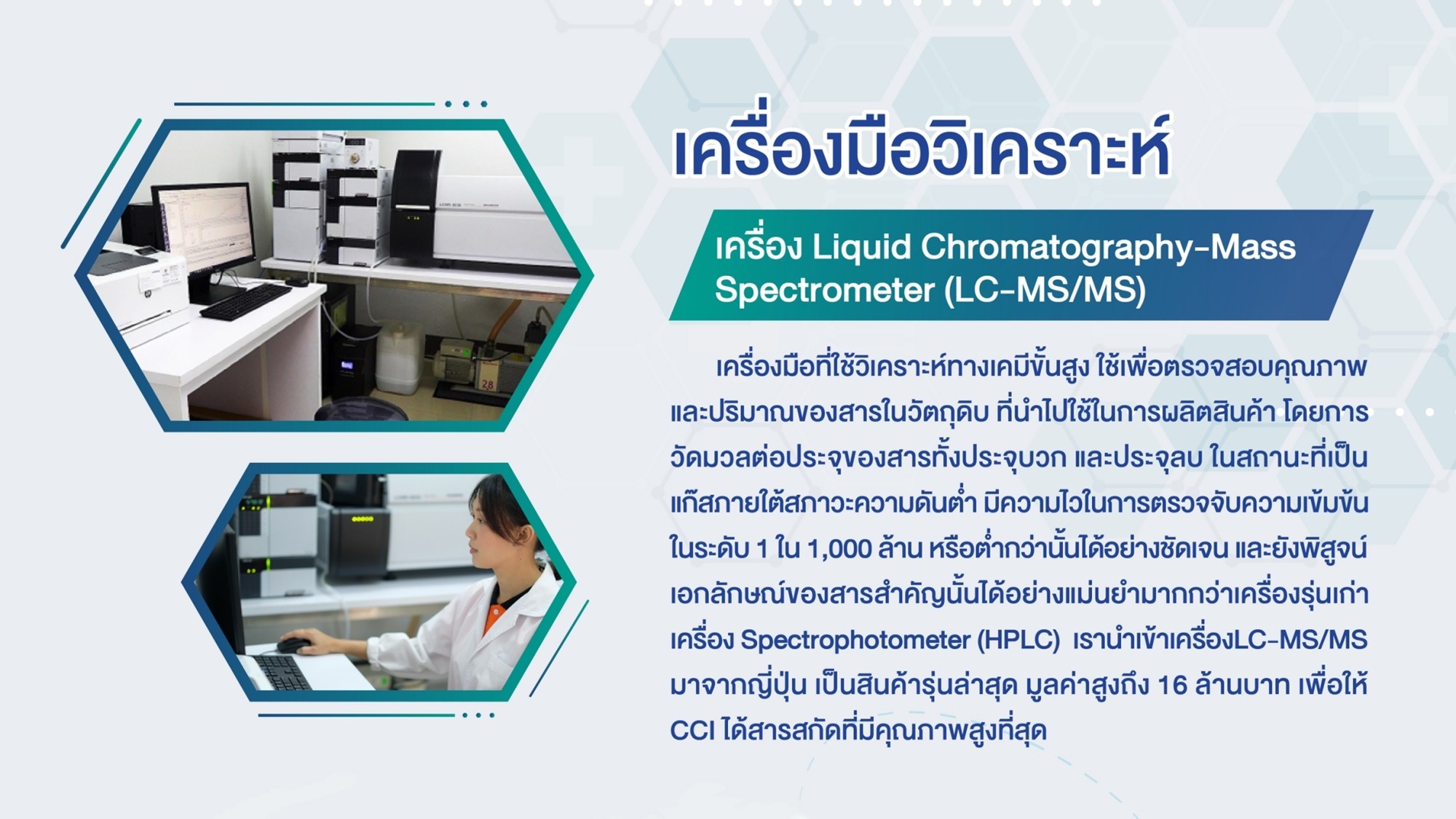 เครื่องมือที่ใช้วิเคราะห์ทางเคมีขั้นสูง เพื่อตรวจสอบคุณภาพ และปริมาณของสารในวัตถุดิบ ที่นำไปใช้ในการผลิตสินค้า นำเข้าจากประเทศญี่ปุ่น เป็นรุ่นล่าสุด มีมูลค่าสูงถึง 16 ล้านบาท