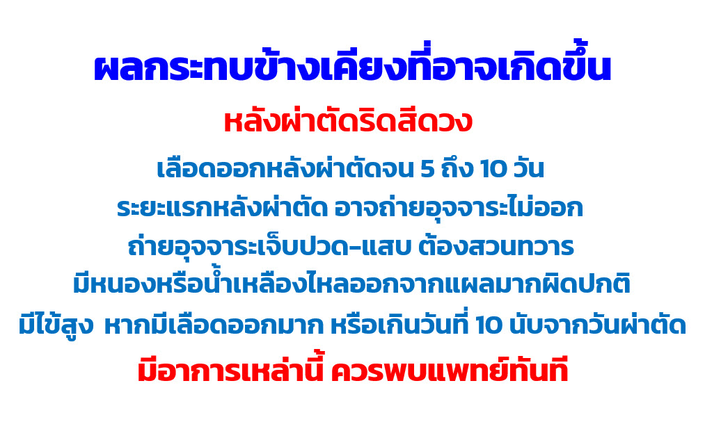 ระยะแรกหลังผ่าตัดอาจถ่ายอุจจาระไม่ออก ถ่ายอุจจาระเจ็บปวด-แสบ ต้องสวนทวาร